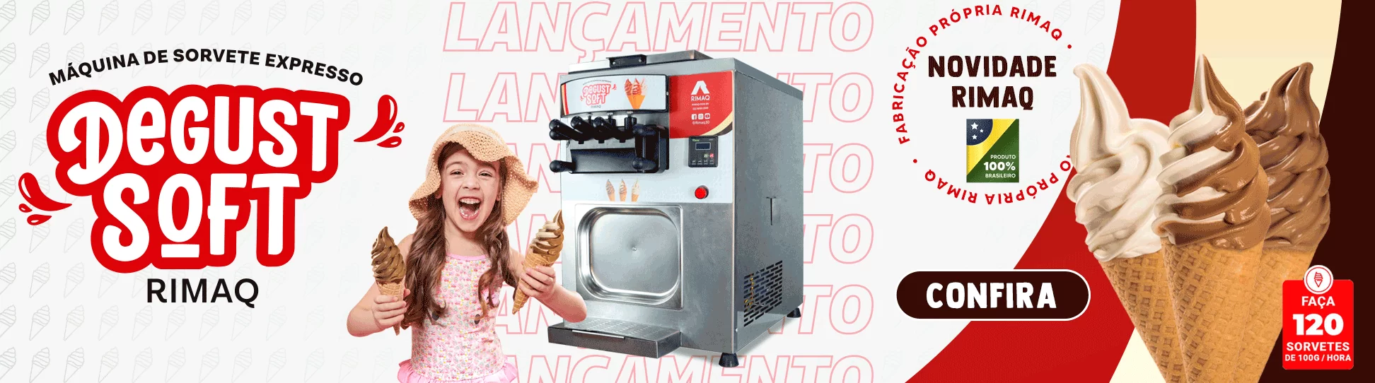 Conheça a Máquina de Sorvete Expresso Degust Soft, capaz de produzir 120 casquinhas de sorvetes por hora. Utiliza sistema de três bicos, sendo dois sabores de sorvetes e um misto.